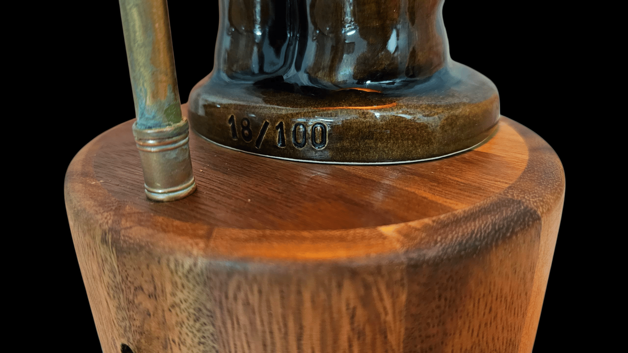 This ceramic lamp is a tribute to the logo used at Steve Crane's chain of tiki restaurants and bars. Most notably as the logo for the Beverly Hills Luau. It was also used as the model for the salt & pepper shakers at the Kon-Tiki, Kon-Tiki Ports, Ports O' Call and Kona Kai. Truly an iconic image in vintage tiki history. This lamp is #18/100 and was made for the 2024 Tiki Oasis San Diego Art Show. This lamp was made by using various vintage lamp parts that were chemically aged. Lamp is permanently attached to a wooden base. This will be a limited numbered edition production of 100 lamps. But not all 100 will be the same. Throughout the production of these lamps I will be making several different styles with varying glazes, light sources and design combinations.