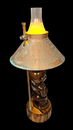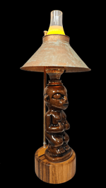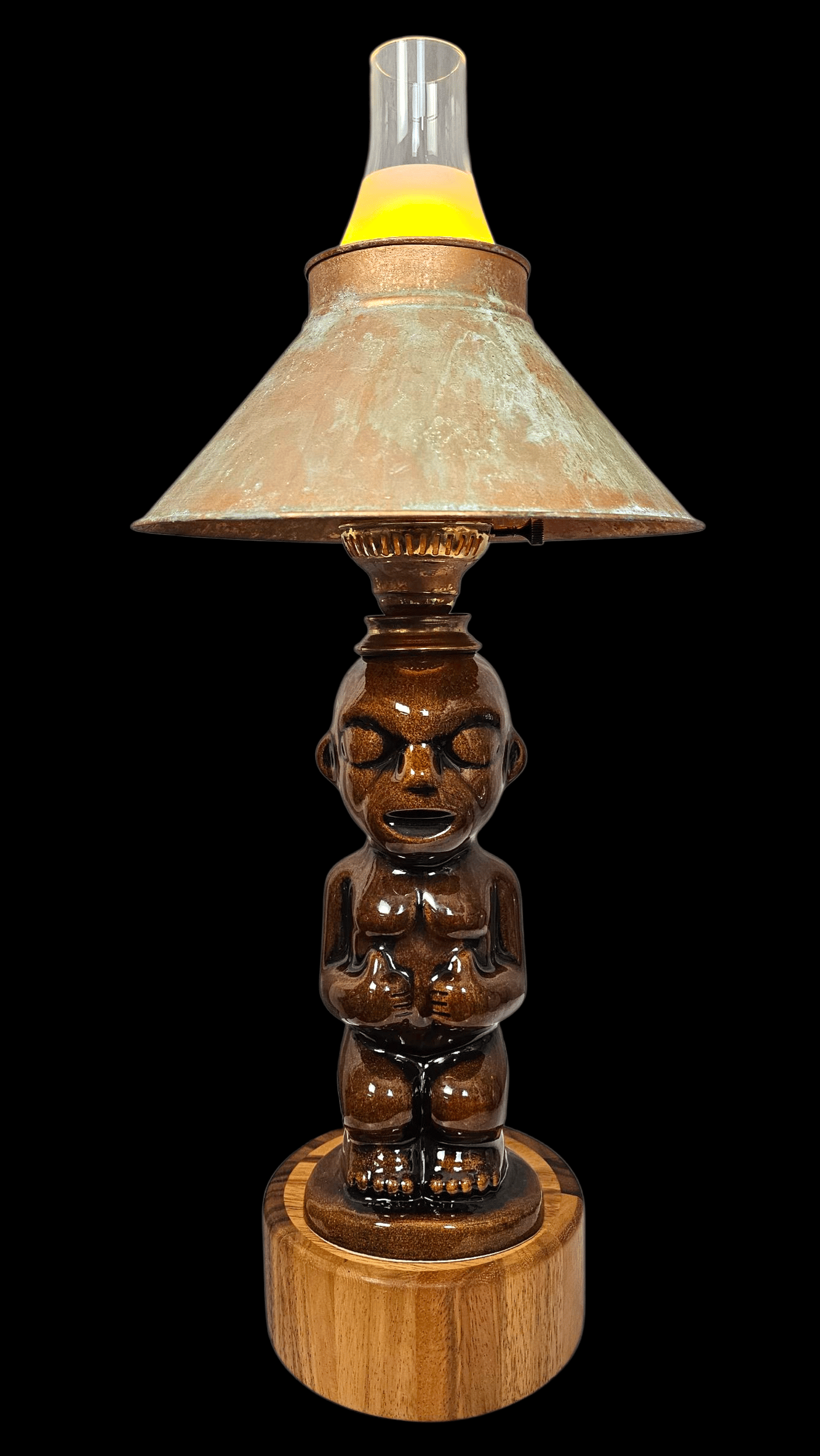 This ceramic lamp is a tribute to the logo used at Steve Crane's chain of tiki restaurants and bars. Most notably as the logo for the Beverly Hills Luau. It was also used as the model for the salt & pepper shakers at the Kon-Tiki, Kon-Tiki Ports, Ports O' Call and Kona Kai. Truly an iconic image in vintage tiki history. This lamp is #19/100 and was made for the 2024 Tiki Oasis San Diego Art Show. This lamp was made by using various vintage lamp parts that were chemically aged. Lamp is permanently attached to a wooden base. This will be a limited numbered edition production of 100 lamps. But not all 100 will be the same. Throughout the production of these lamps I will be making several different styles with varying glazes, light sources and design combinations.