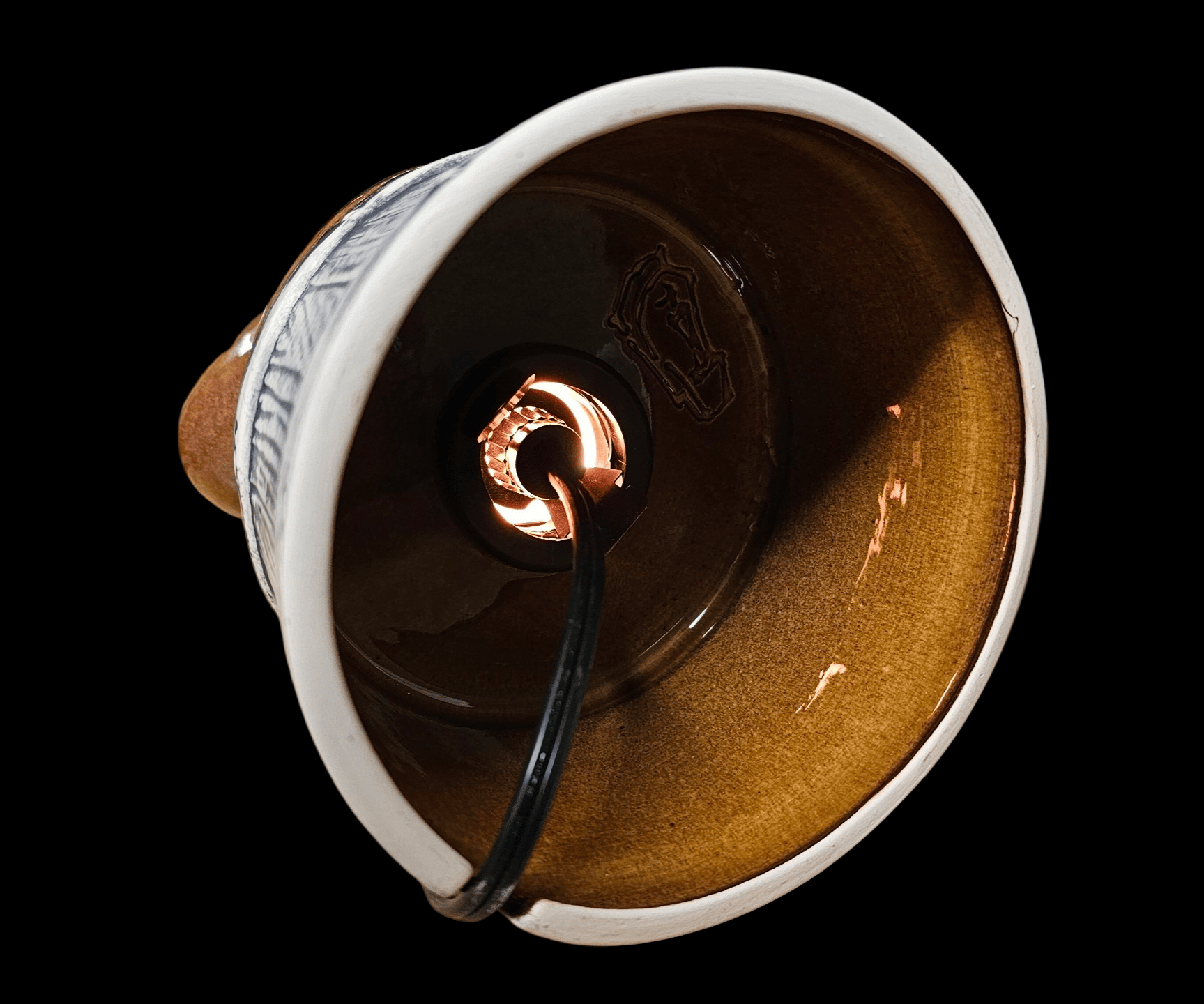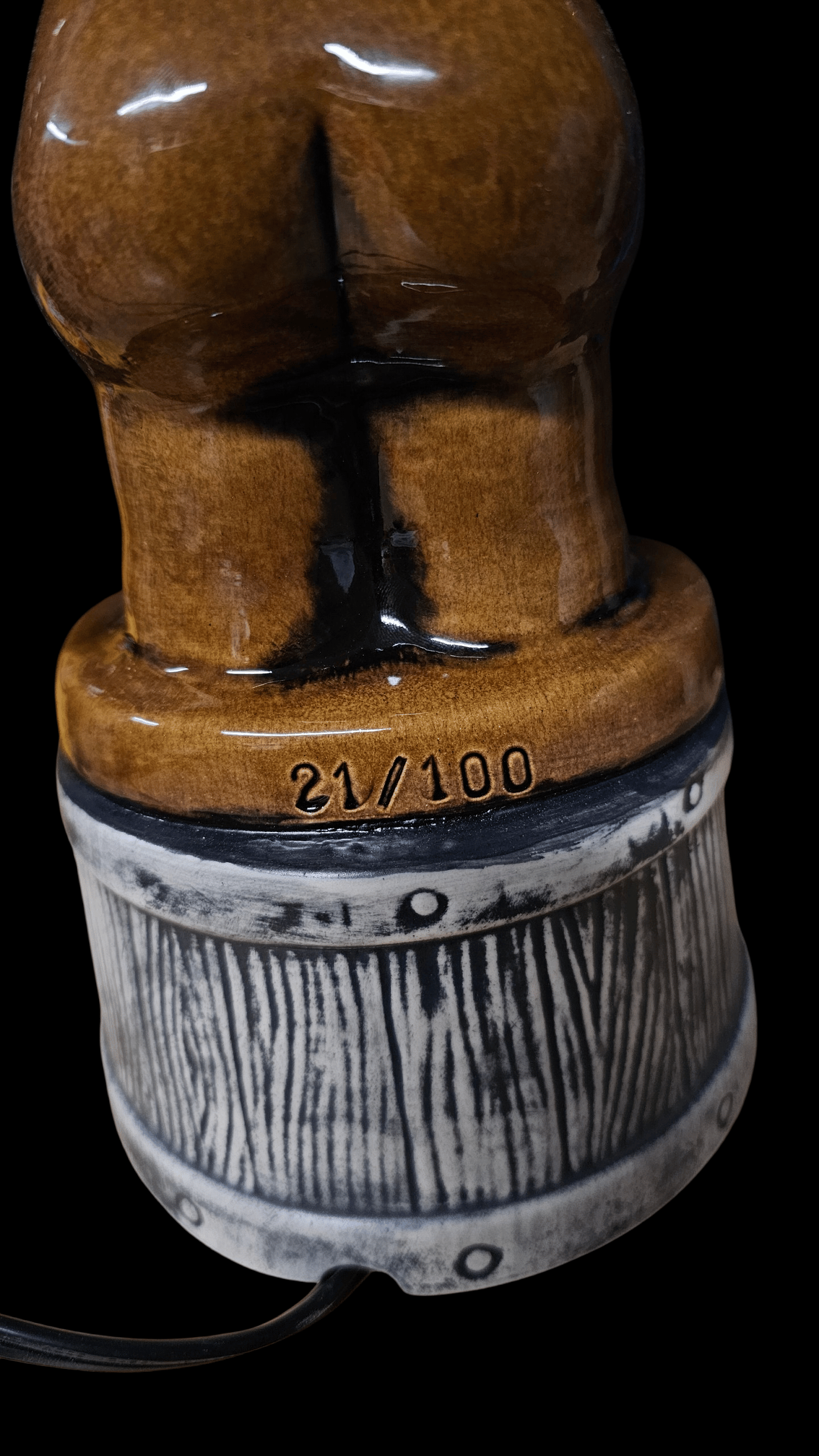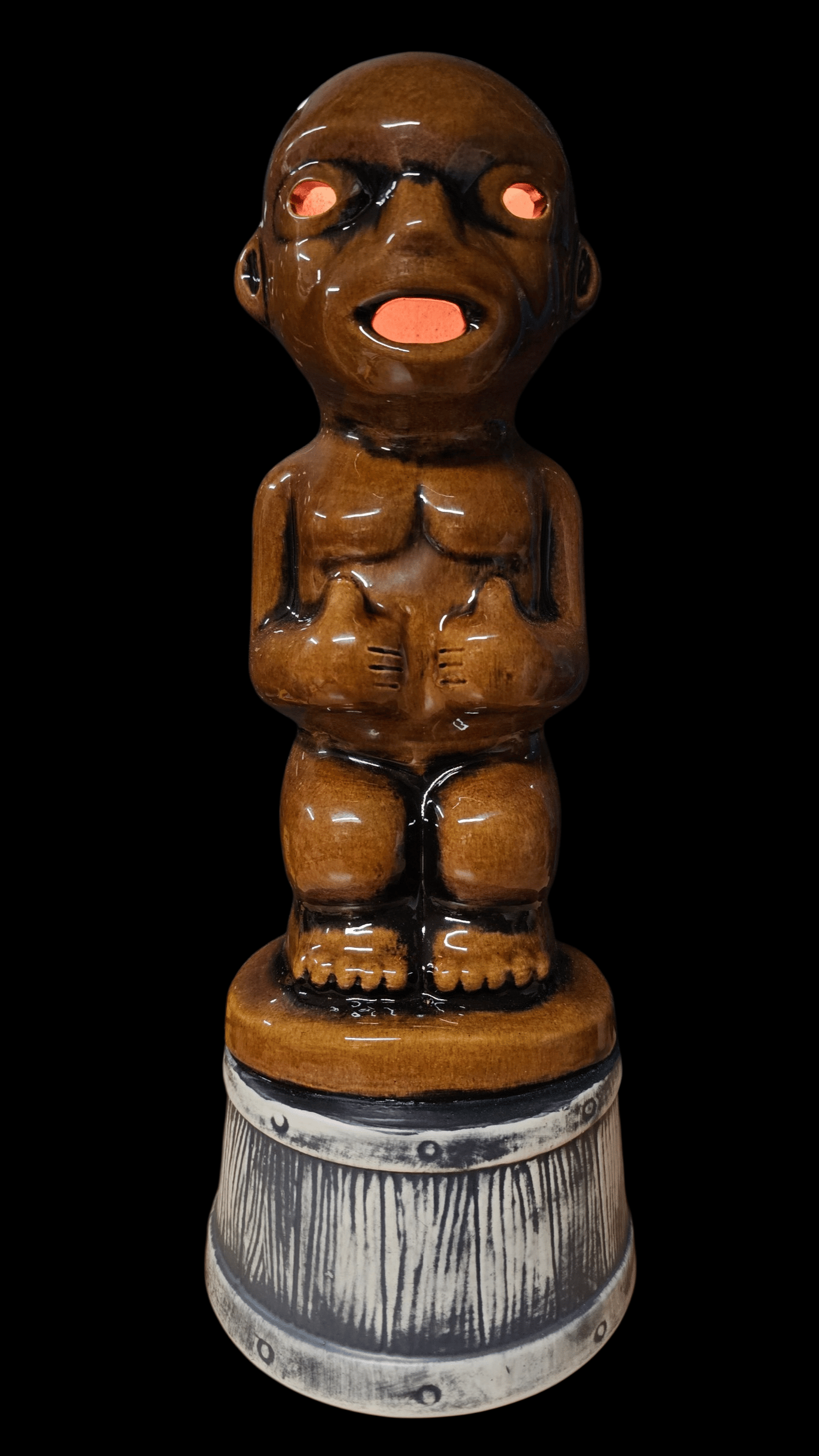 This all ceramic lamp is a tribute to the logo used at Steve Crane's chain of tiki restaurants and bars. Most notably as the logo for the Beverly Hills Luau. It was also used as the model for the salt & pepper shakers at the Kon-Tiki, Kon-Tiki Ports, Ports O' Call and Kona Kai. Truly an iconic image in vintage tiki history. This lamp measures just over 13" tall! This lamp will come equiped with a 6' long clip in lamp cord with an inline on/off switch, pre-instaled LED flame bulb and a rubber grommet to keep the cord and bulb nice and snug. This will be a limited edition production of 100 lamps. But not all 100 will be the same. Throughout the production of these lamps I will be making several different styles with varying glazes, light source and design combinations. This lamp is #21 of 100 and is glazed a gloss brown (similar to the vintage shakers) with a weathered barrel base. Flat domestic shipping rate of $25. Please contact for international shipping.