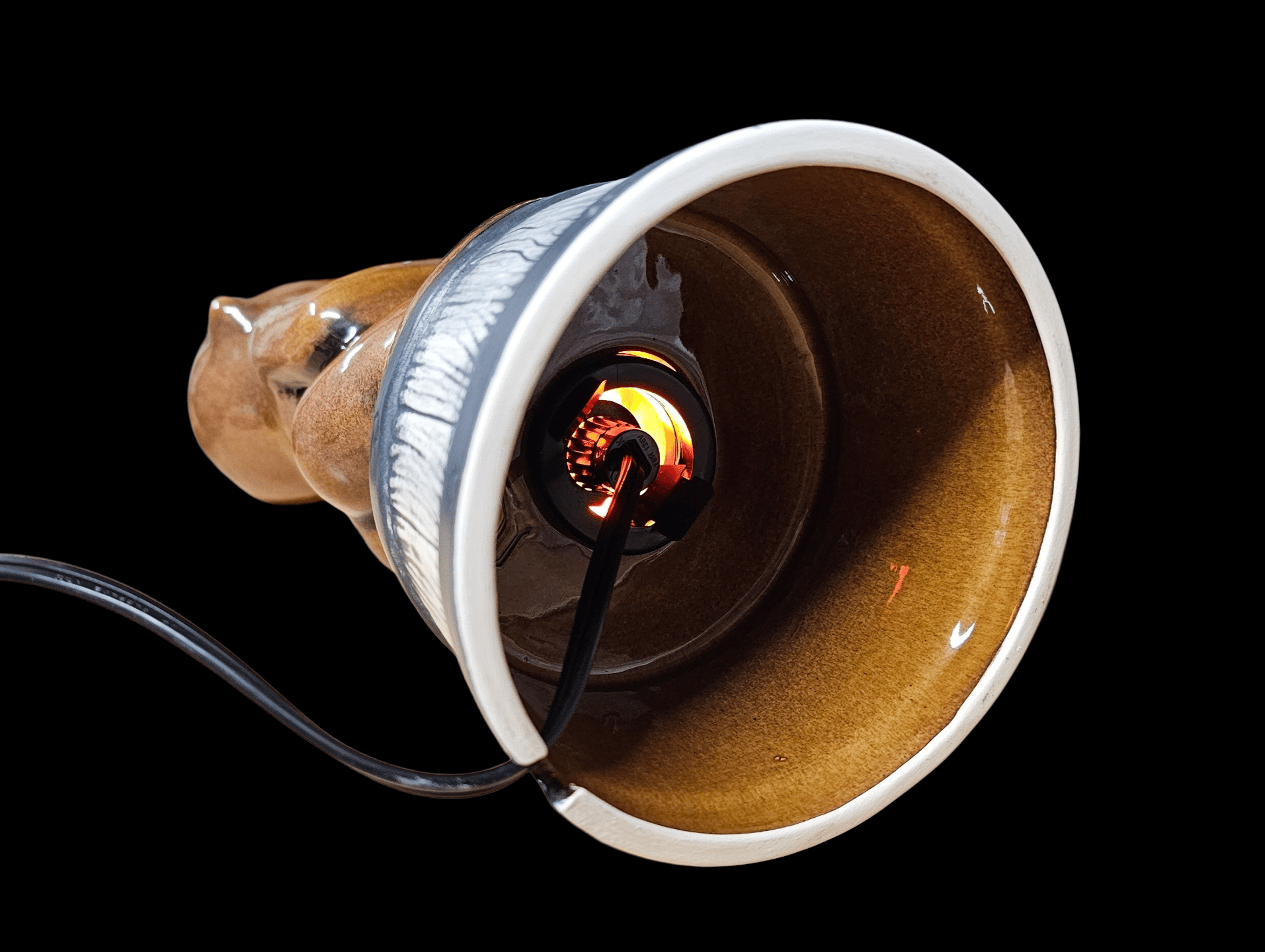 This all ceramic lamp is a tribute to the logo used at Steve Crane's chain of tiki restaurants and bars. Most notably as the logo for the Beverly Hills Luau. It was also used as the model for the salt & pepper shakers at the Kon-Tiki, Kon-Tiki Ports, Ports O' Call and Kona Kai. Truly an iconic image in vintage tiki history. This lamp measures just over 13" tall! This lamp will come equiped with a 6' long clip in lamp cord with an inline on/off switch, pre-instaled LED flame bulb and a rubber grommet to keep the cord and bulb nice and snug. This will be a limited edition production of 100 lamps. But not all 100 will be the same. Throughout the production of these lamps I will be making several different styles with varying glazes, light source and design combinations. This lamp is #24 of 100 and is glazed a gloss brown (similar to the vintage shakers) with an aged barrel base. Flat domestic shipping rate of $25. Please contact for international shipping.